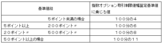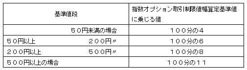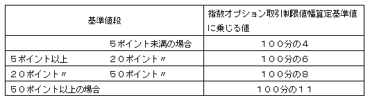 各限月取引の取引開始日の前日における50ポイント刻みの東証株価指数設定基準値(その日の最終の東証株価指数の数値に最も近接する50ポイントの整数倍の数値(当該数値が2種類ある場合は、高い方の数値)をいう。以下同じ。)及び当該50ポイント刻みの東証株価指数設定基準値に近接する上下各6種類の50ポイントの整数倍の数値とする。
