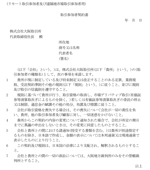 取引参加者契約書(リモート取引参加者及び遠隔地市場取引参加者用)(大阪取引所)